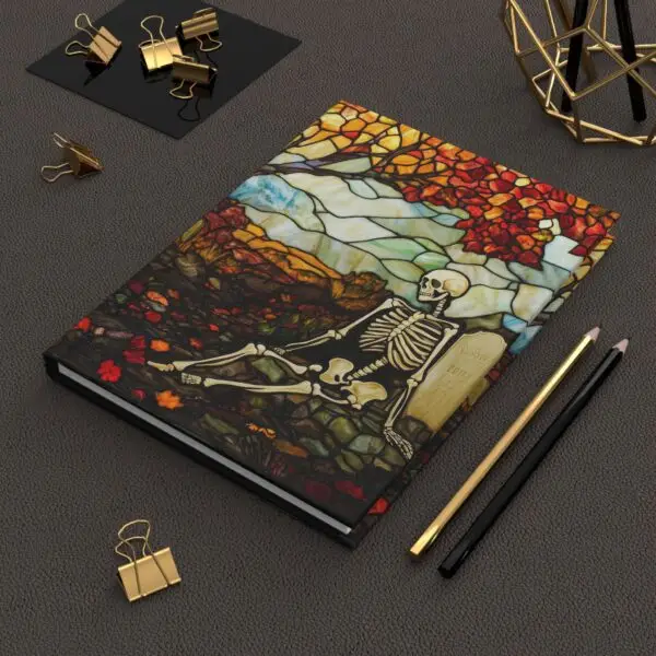 Introducing the “Autumn Requiem” Hardcover Journal – a strikingly beautiful and practical choice for those who cherish the art of writing. This journal features a captivating full wraparound print of a stained glass skeleton surrounded by a serene autumn graveyard, offering a unique blend of gothic elegance and autumnal charm.