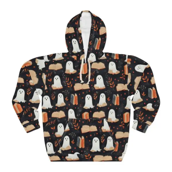Product Description: Crafted from 100% polyester, this medium-weight hoodie (7.4 oz/yd² or 250 g/m²) is designed to keep you warm and comfortable while maintaining a breathable fit. The “Haunted Library” design features an all-over print of enchanting bookshelves, spectral visitors, and a mysterious atmosphere that captures the essence of a gothic novel come to life.
