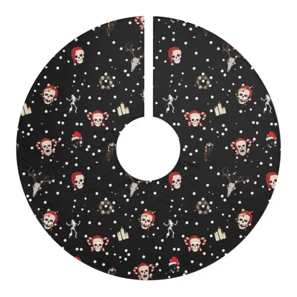 Crafted from the softest polyester fleece, this tree skirt offers a cozy, plush foundation for your presents, creating a sumptuous backdrop that contrasts beautifully against the traditional green of your Christmas tree. The one-sided print comes alive with the Nocturnal Yuletide pattern—where Gothic elegance meets festive cheer in a dance of snowflakes, skulls, black cats, spiders, and skeletal reindeer.
