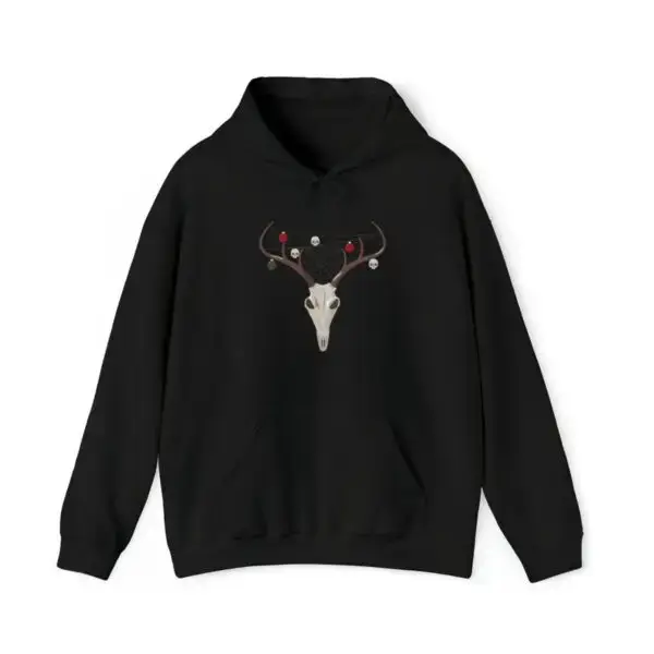 Unveil a chillingly festive addition to your winter wardrobe with our “Reindeer Necromancy” Hooded Sweatshirt. It’s not just a garment but a statement—a unisex hoodie that merges the comfort of a classic fit with the enigmatic allure of a reindeer skull adorned with Christmas baubles and macabre skulls dangling from its antlers.