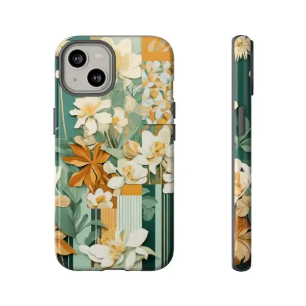 Your eyes will dance over the abstract mosaic pattern, a harmonious collage of layered paper flowers in a refreshing palette of sea green, sun-kissed yellow, creamy white, and tantalizing orange tones. The rich textures and intricate details create a tactile illusion, inviting touch and exploration. Each glimpse of the case offers a renewed appreciation of its complex and sophisticated artistry, resembling a garden in full bloom at sunset.